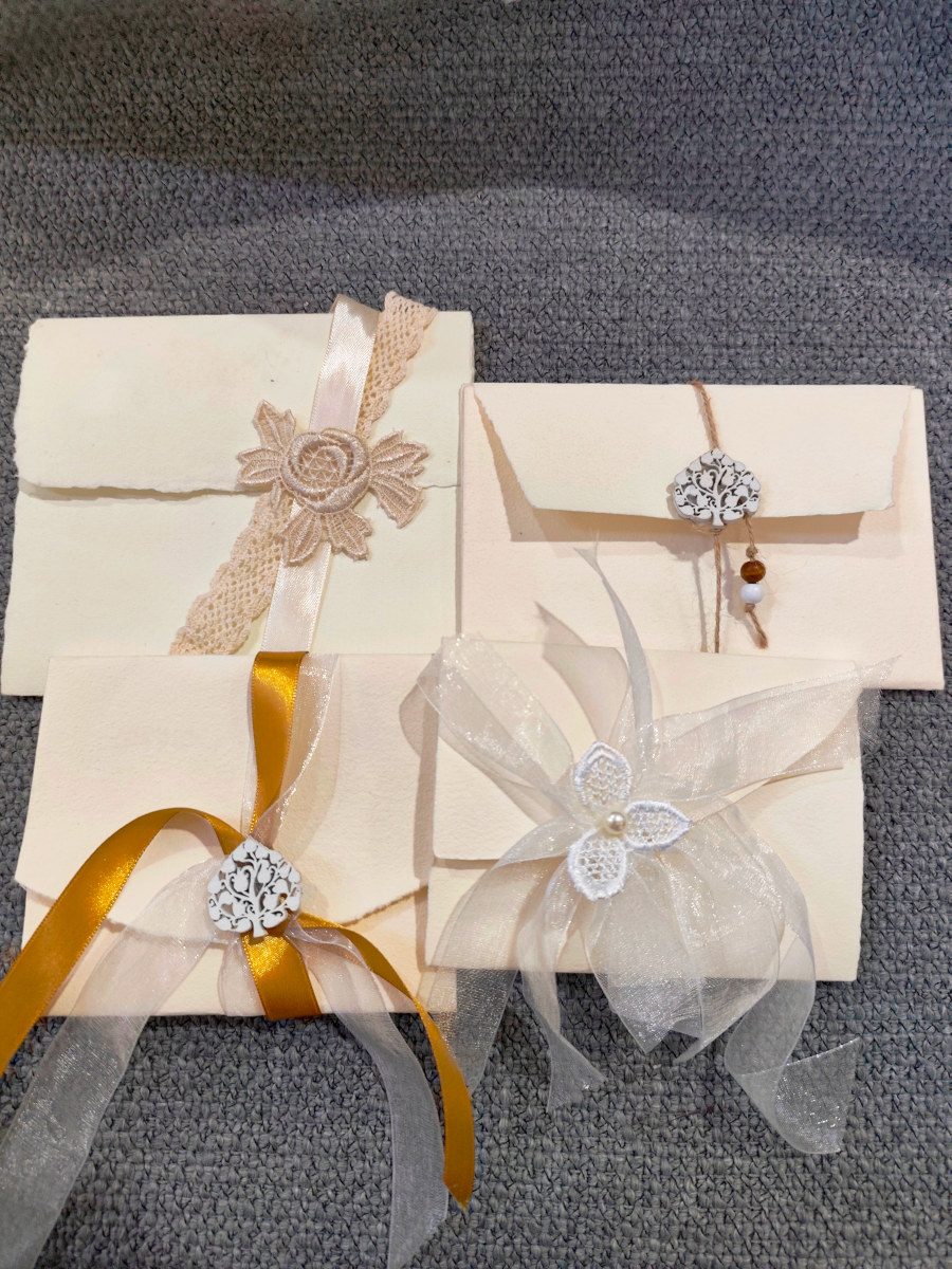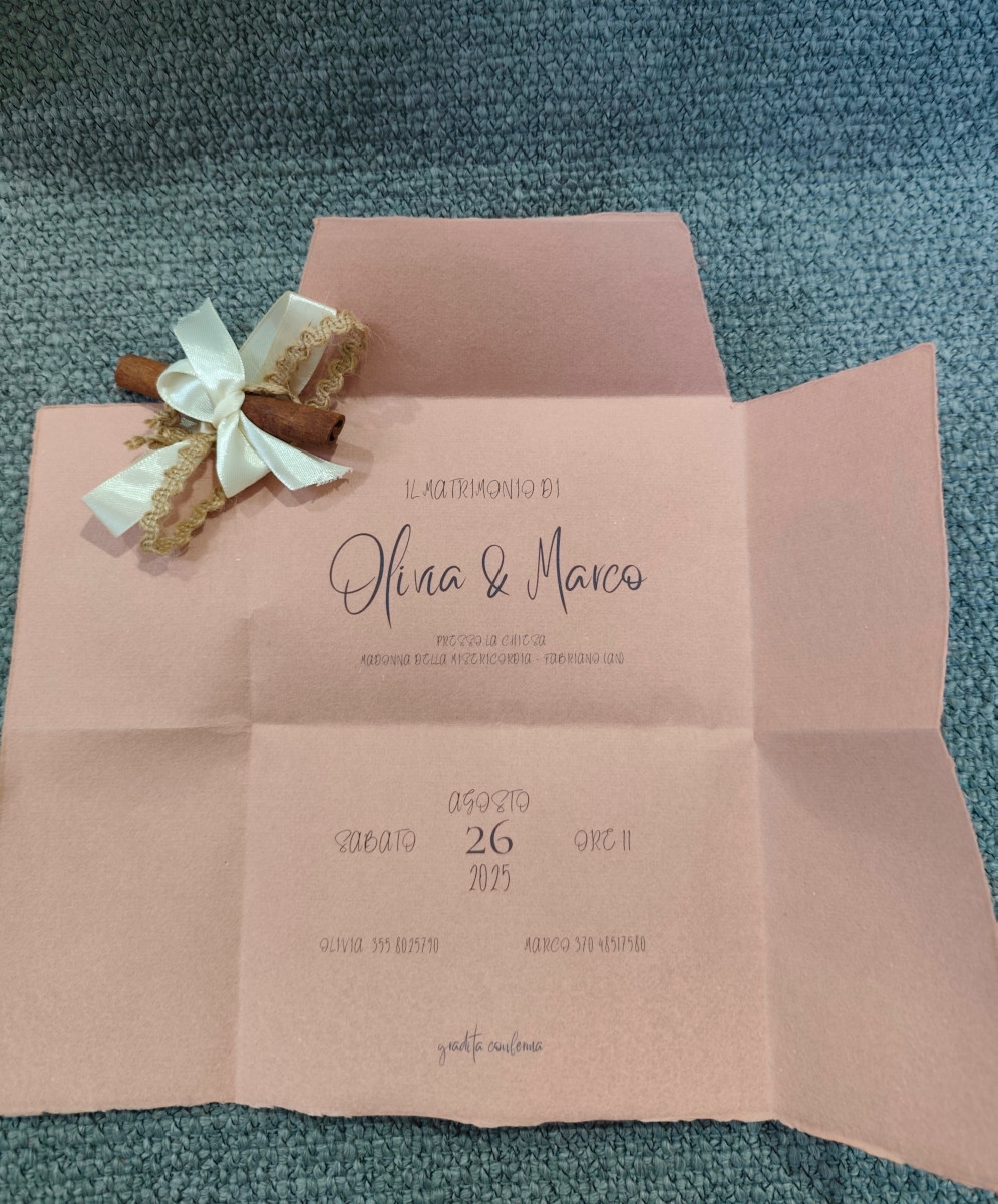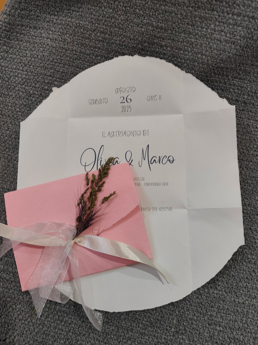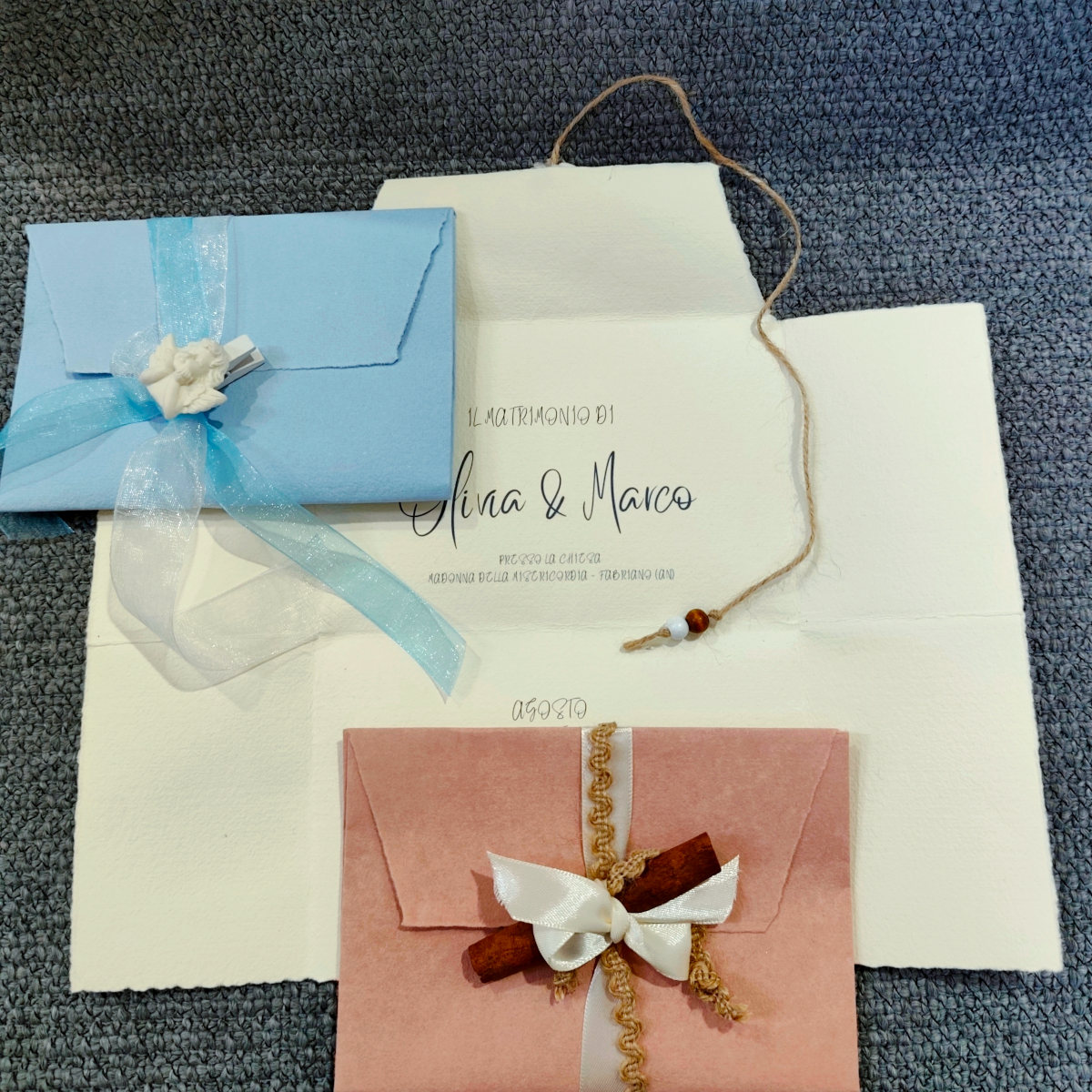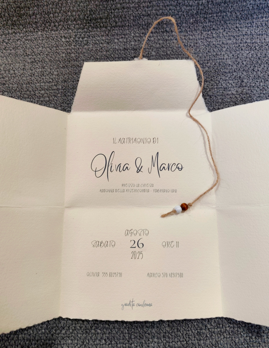 Partecipazioni di nozze eleganti e pregiate di diversi formati, realizzate con carta fatta a mano 200gr grana fine o vergata anche con filigrana.